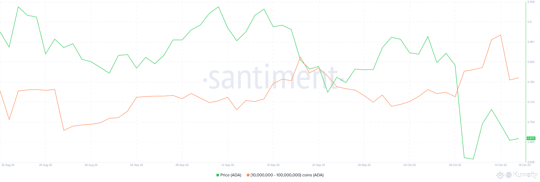 غالبًا ما تعمل تحركات الحيتان كمؤشرات مبكرة لتحولات الشعور، وبيعهم الأخير يظهر نقصًا في الثقة في المكاسب قصيرة الأجل. بينما لا يزال السوق الأوسع يمتص التدفقات المتزايدة، فشل ADA في الحفاظ على المستويات الرئيسية قد يؤدي إلى مزيد من ضغط البيع.