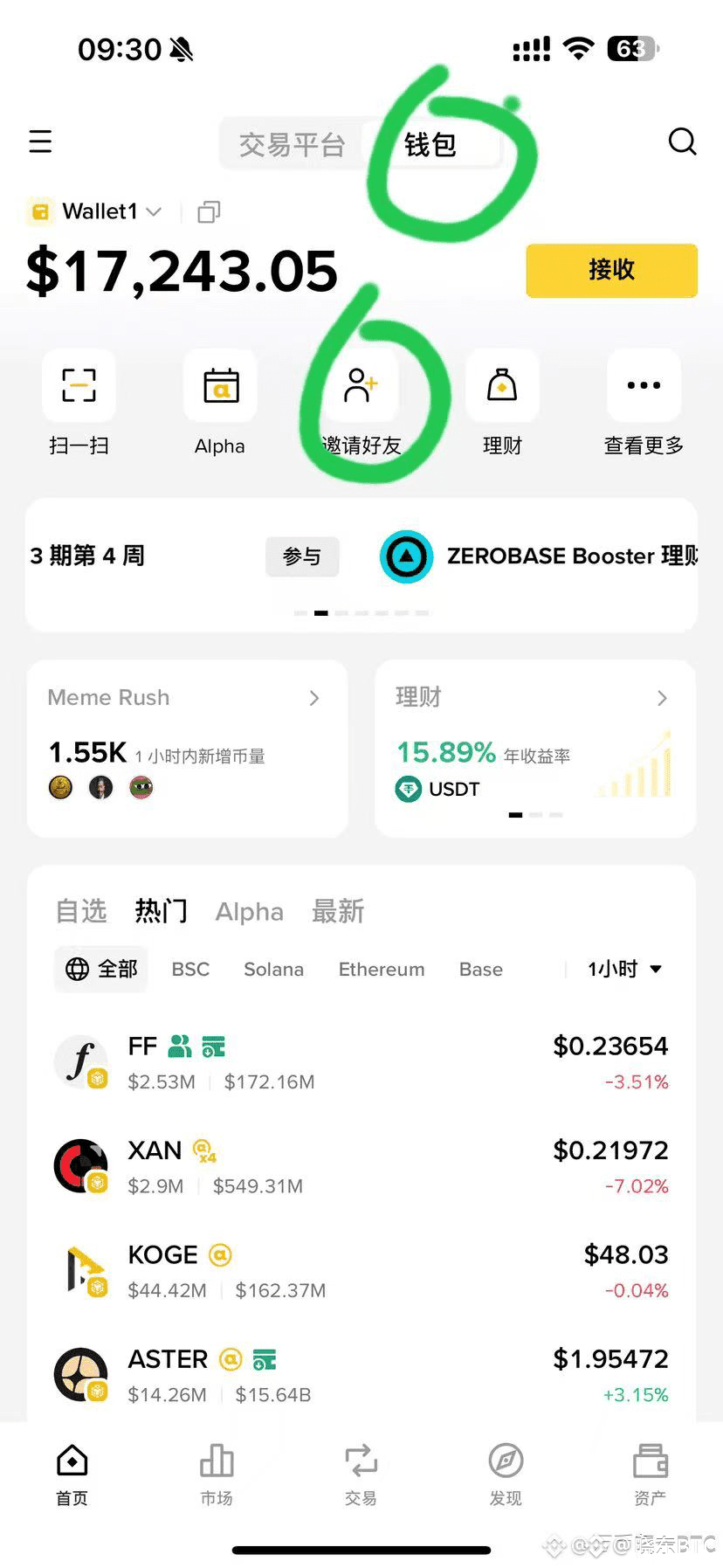 第1步,打开币安app,右上角点“钱包”→邀请好友