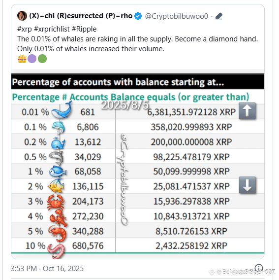A recent update from crypto analyst Cryptobilbuwoo0 gives a clear picture of XRP’s current distribution, showing exactly how much XRP you need to rank among the top 10% of holders. The data comes from the XRP Ledger as of October 16, 2025, and highlights how concentrated $XRP ownership has become.