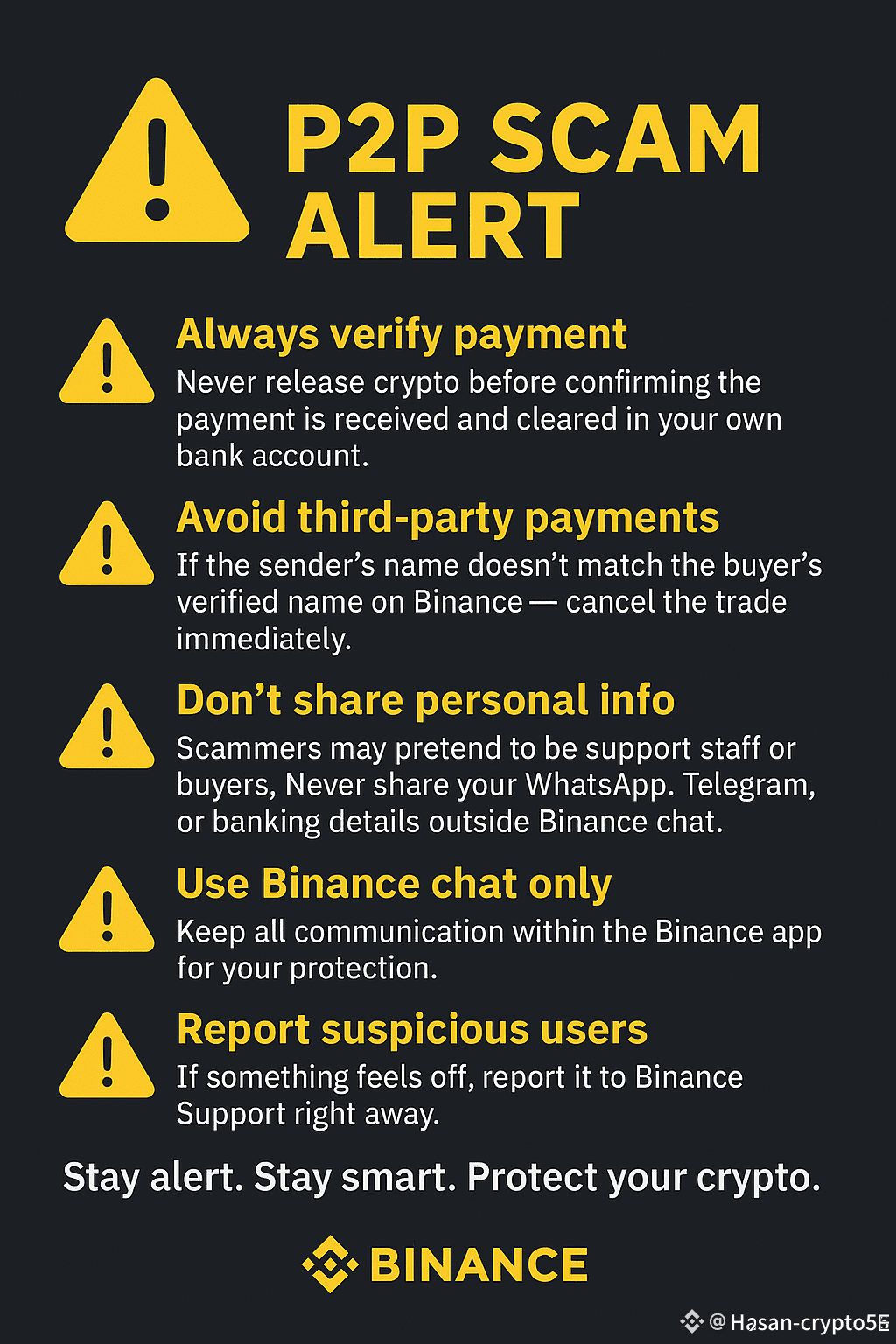 Keep all communication within the Binance app for your protection.
