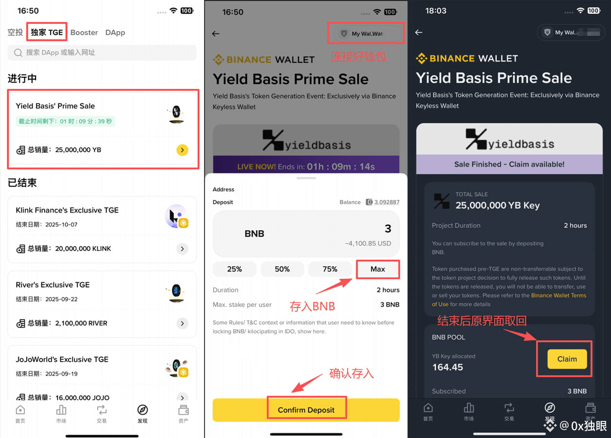 参与流程其实很简单,在TGE活动开启期间→BNB到位币安钱包→Alpha活动→TGE→活动界面→右上角链接钱包→Deposit(存入)→输入存的BNB数量→确认→活动结束后→活动界面→Claim(取回)→扣除购买新币的费用后,剩余的BNB回到币安钱包(由于活动很多人参与,链上会比较拥挤,到账时间可能长达20~30分钟,耐心等待即可)