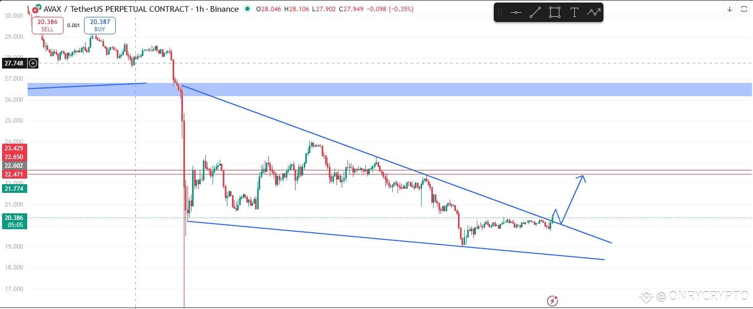 Hope you can see This AVAX/USDT 1H chart. This chart shows a falling wedge pattern, which is a bullish reversal sign. Price is testing the upper trendline, so Avax will retest this trendline again and then we can see a potential breakout to the upside. If the breakout is confirmed with strong volume, a long entry can be considered.