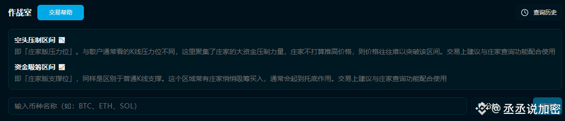 资金吸筹区间 📈(用来多单进场或者空单离场的区间) 即「庄家版支撑位」,同样是区别于普通K线支撑。这个区域常有庄家悄悄吸筹买入,通常会起到托底作用。交易上建议与庄家查询功能配合使用