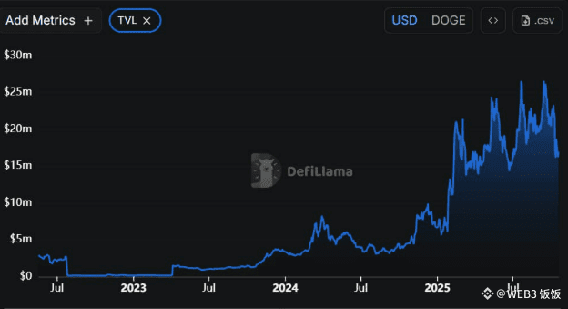 与此同时,DeFi 锁仓资金(TVL)已经涨到 1698 万美元,还在稳步上涨,说明狗狗币不仅是表情包,它开始变成“能用的钱”了。
