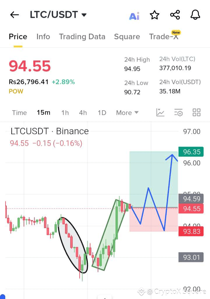 #Litecoin is showing strong recovery signals after rebounding from the 90 support zone. The 15m chart indicates a clean reversal pattern, with price attempting to establish higher lows and target the 96 region. A breakout above 95 could trigger fresh buying momentum toward short-term resistance.