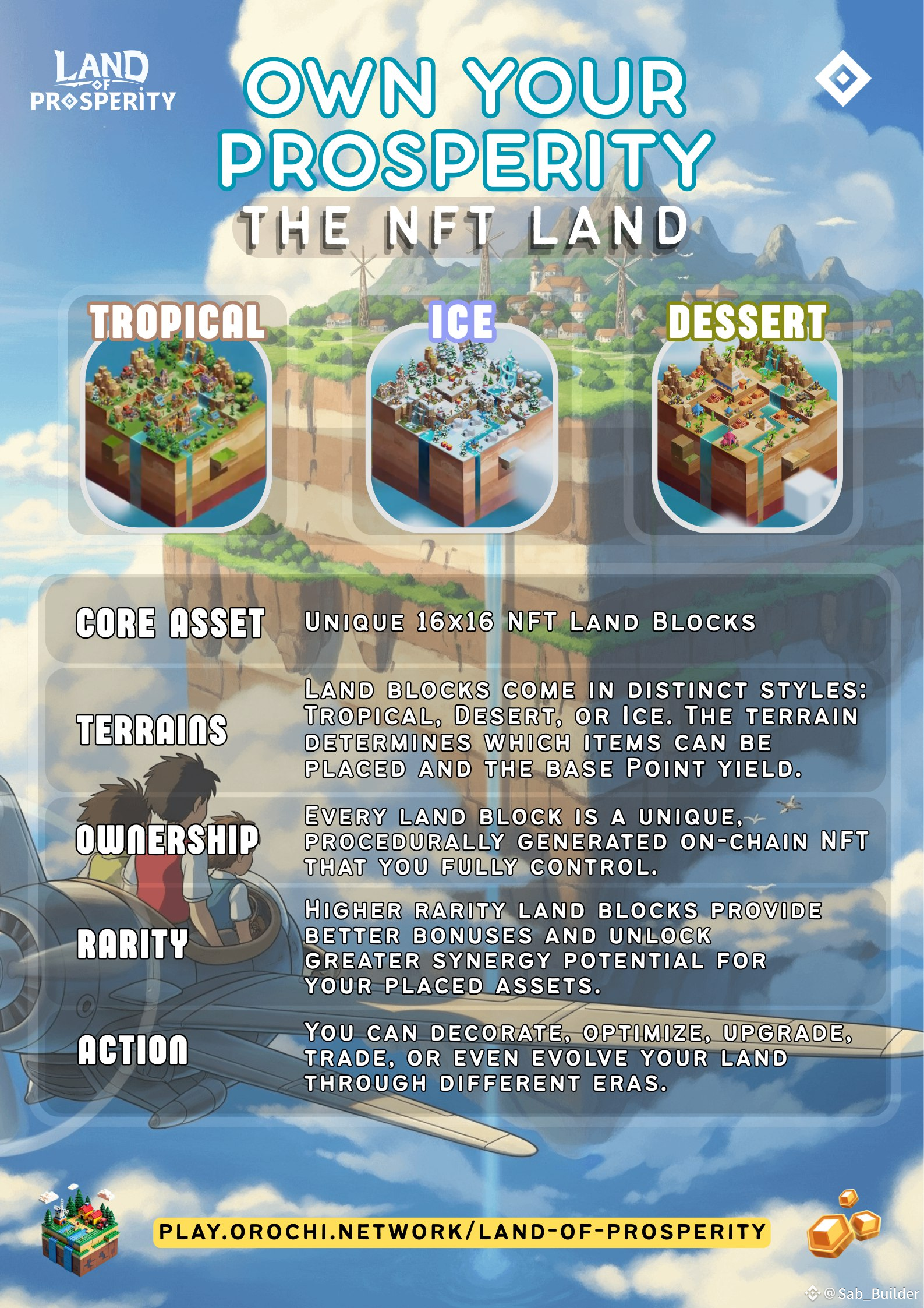Start with a unique 16x16 NFT Land Block (Tropical, Desert, or Ice). It's yours—procedurally generated, fully customizable, and secured on-chain.