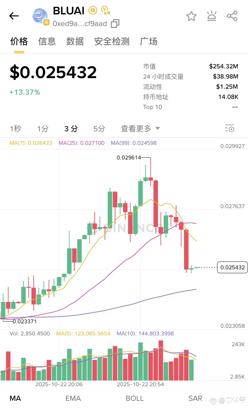 结合最新的K线图数据,$BLUAI 展现出强劲的上升势头,当前价格为$0.025432,较前段时间上涨13.37%,市场情绪积极,交易量达到2.85万,充分反映了投资者的信心与热情!
