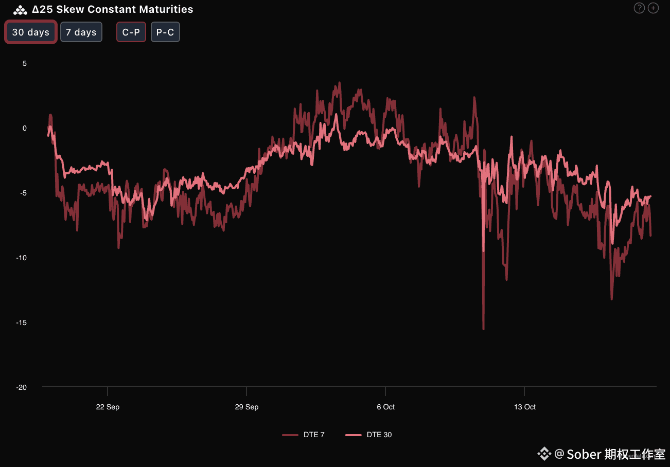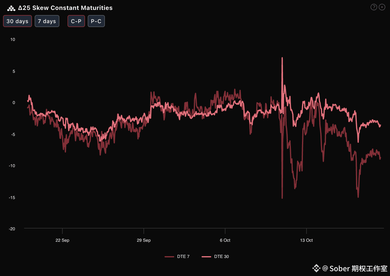 通过Delta 25 Skew(看涨期权隐含波动率IV - 看跌期权IV)观察:近期BTC与ETH的该指标基本处于显著的负值区间,意味着市场对下行(看跌)尾部风险赋予了更高定价,看跌情绪或下行对冲需求极为旺盛。更值得警惕的是:DTE 7天(7天后到期合约)的负Skew值比DTE 30天更剧烈,且ETH的DTE 7天负Skew值远低于BTC——这直接指向两个结论: