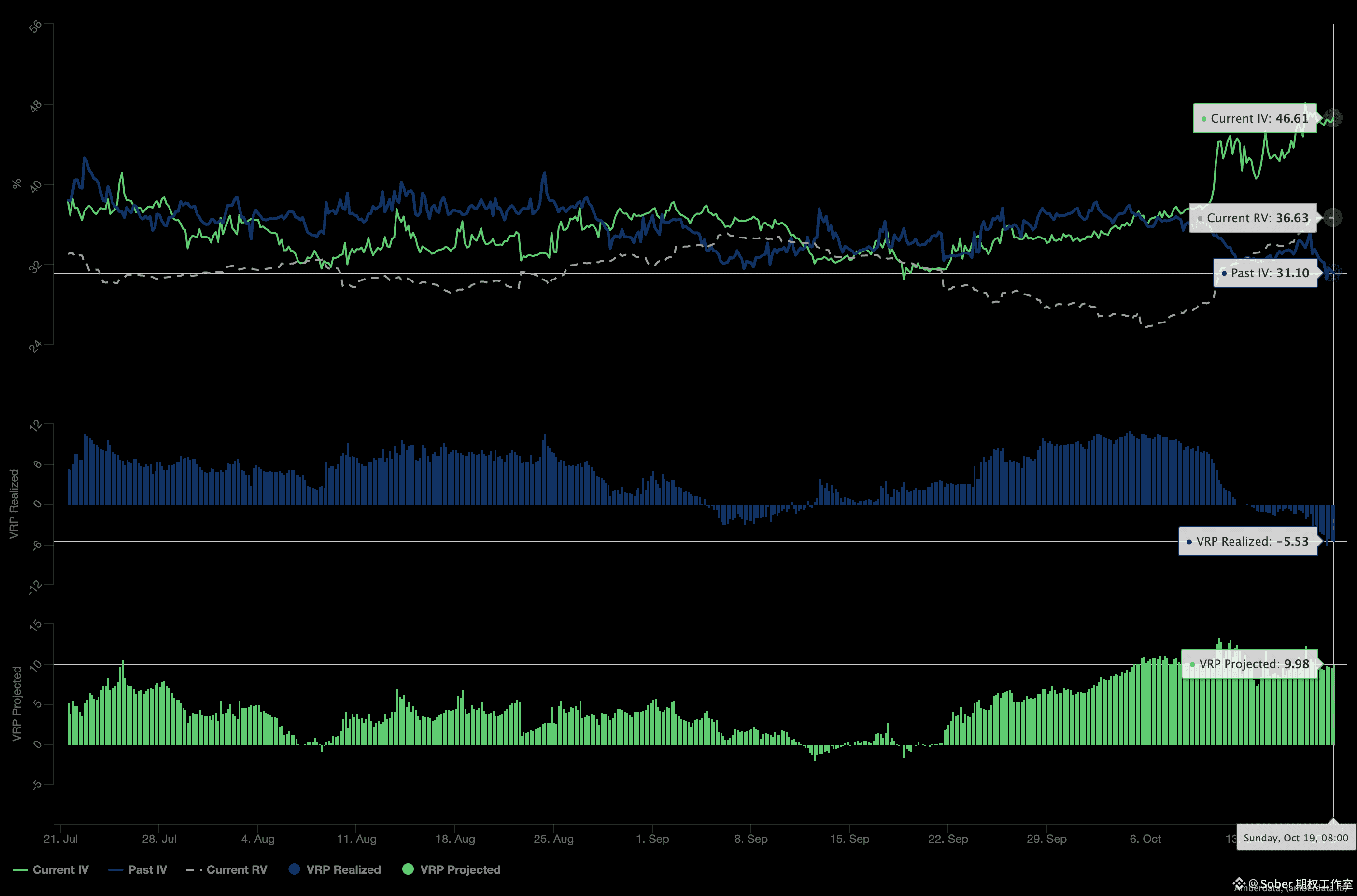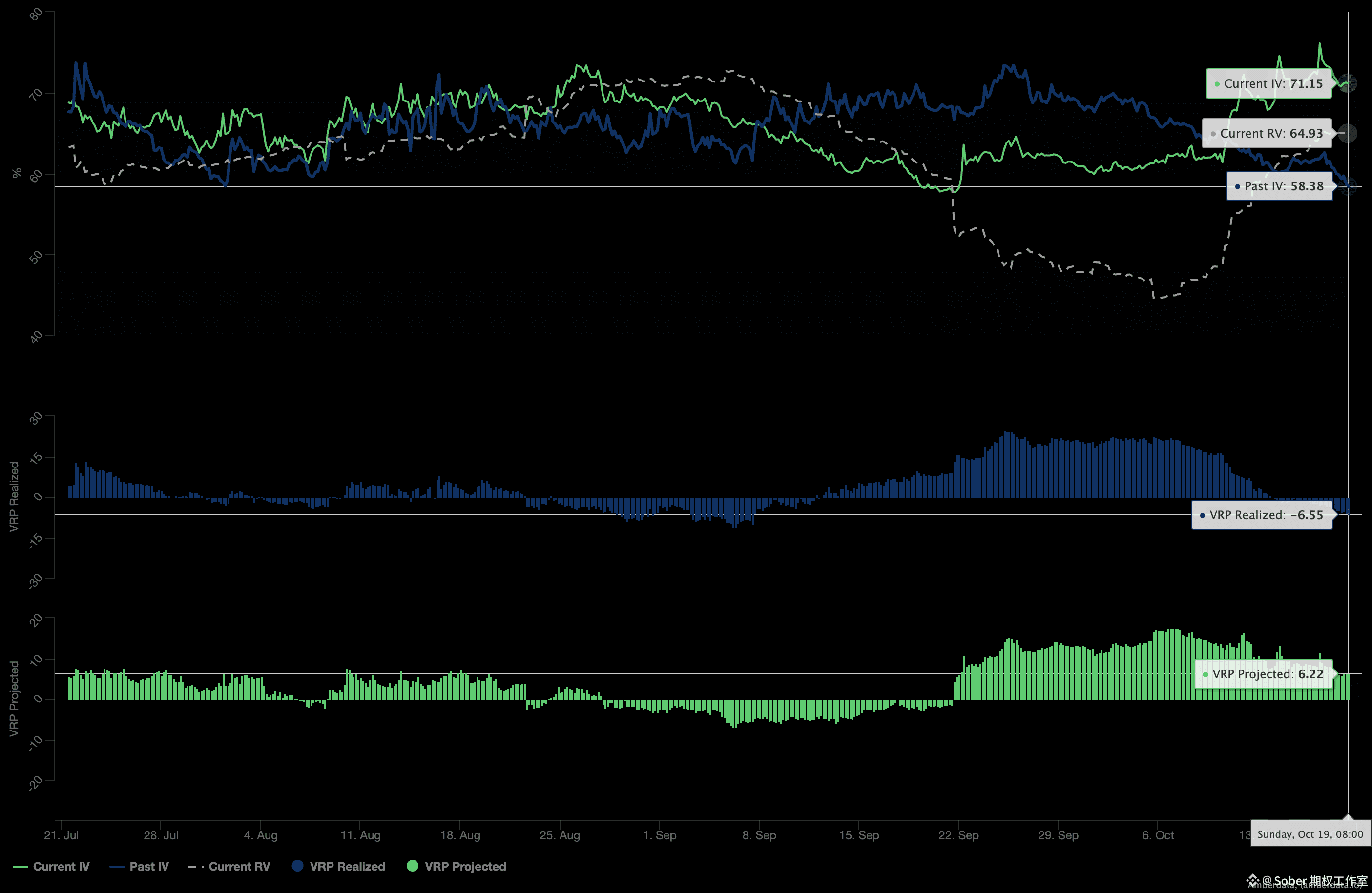 VRP Projected(预期部分)处于高正值(历史高位):表明当前隐含波动率(IV)被市场普遍认为“定价过高”,且预期未来30天内实际波动率(RV)将大幅回落——从表面看,这似乎暗示“做空波动率(Short Volatility)”策略的吸引力正在增强。