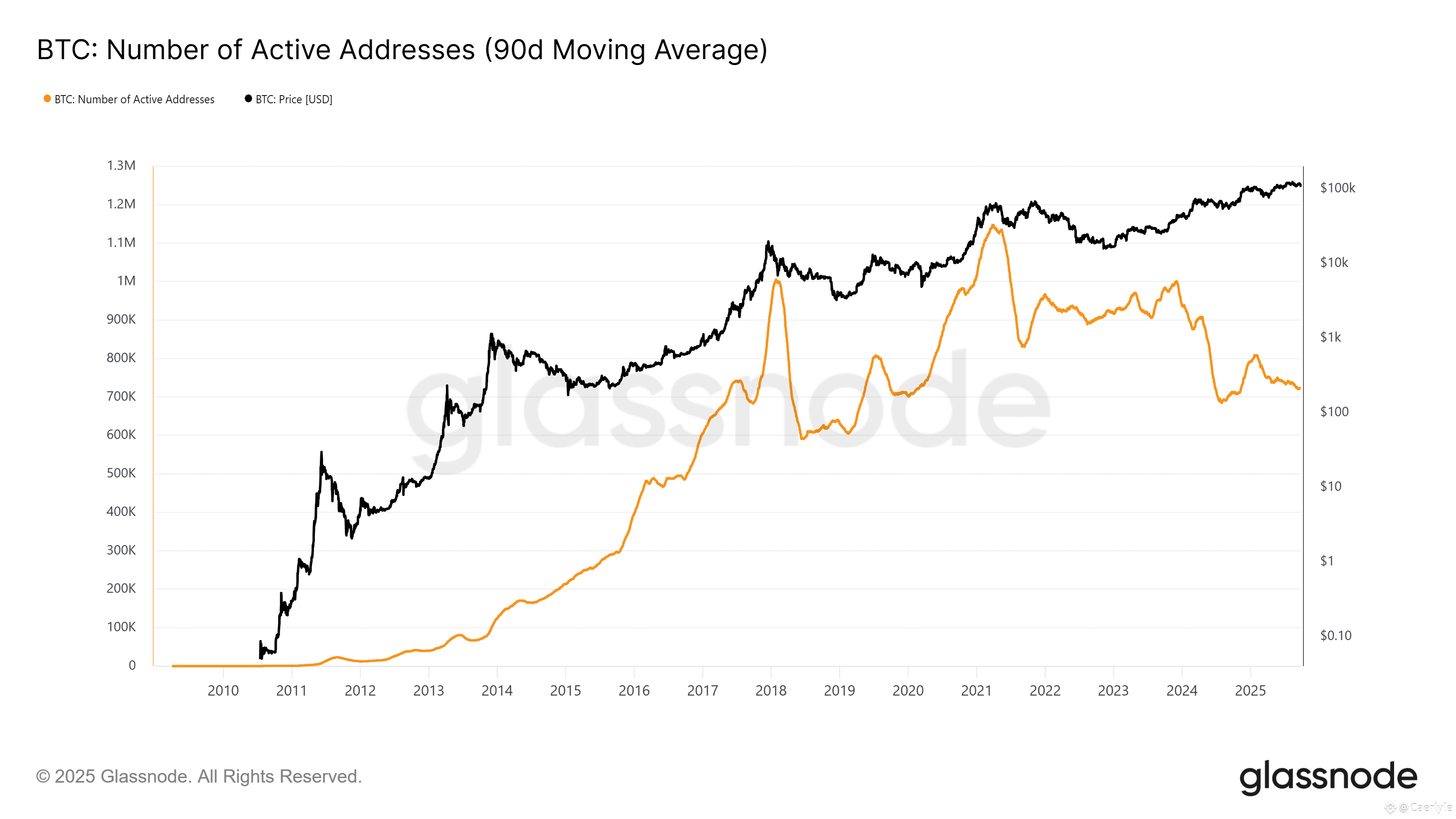 Glassnode – BTC Active Addresses and Transactions (90-Day MA, 2025)