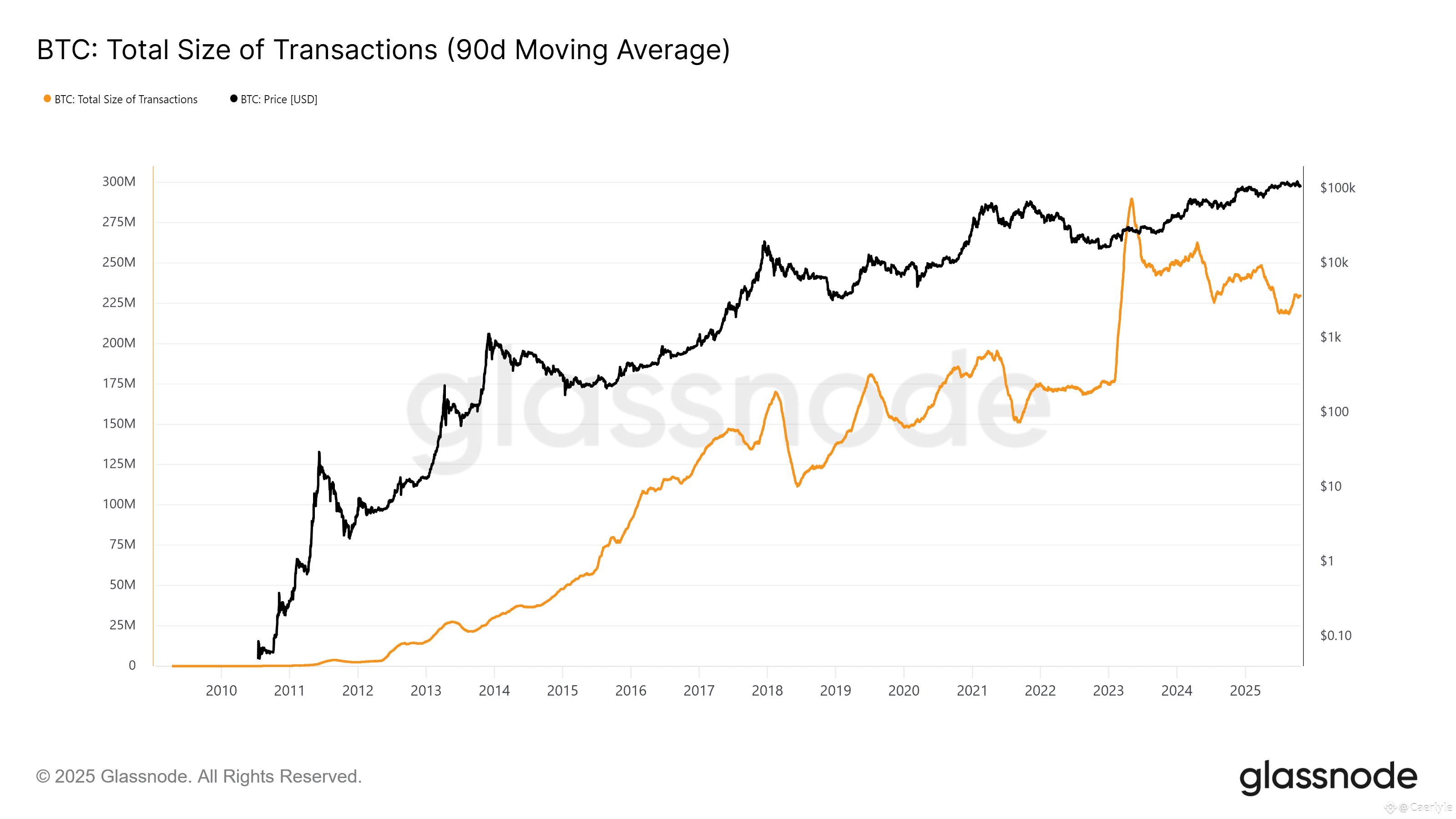 According to Glassnode, while the number of active Bitcoin addresses has continued to decline through 2024–2025, the total size of on-chain transactions is climbing again — signaling more value being transferred across fewer hands.