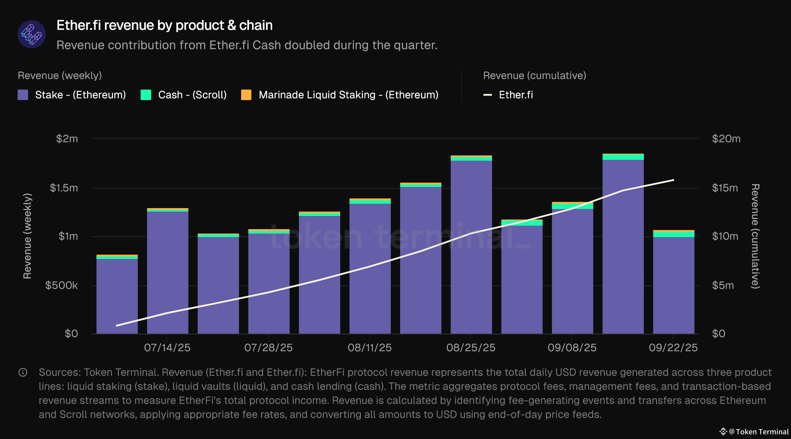 Q3 weekly fees ranged from $3.7M to $7.1M, totalling $77M for the quarter, while weekly revenue ranged from $817k to $1.8M, totalling $16.9M. Liquid staking products generated the overwhelming majority of both fees and revenue, though Ether.fi Cash saw significant growth in percentage terms, more than doubling its revenue contribution from 2.73% at Q3 start to 5.51%.