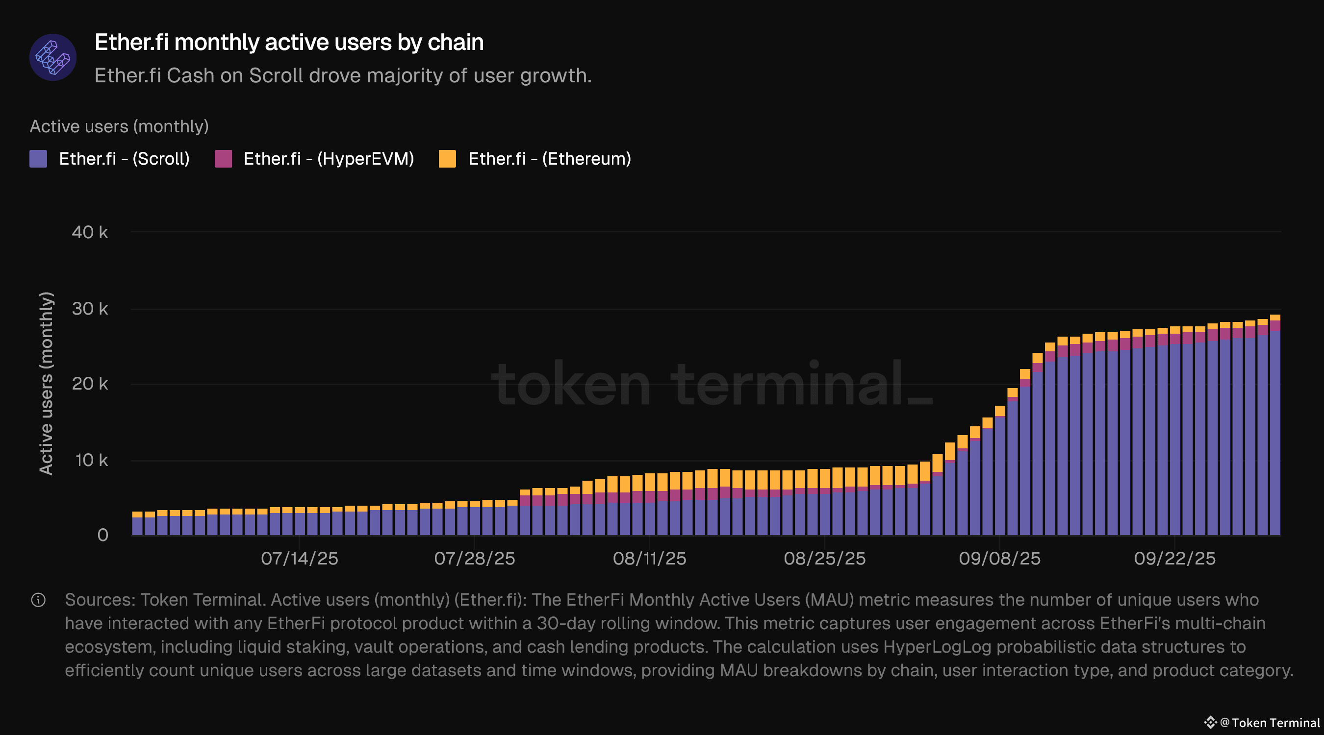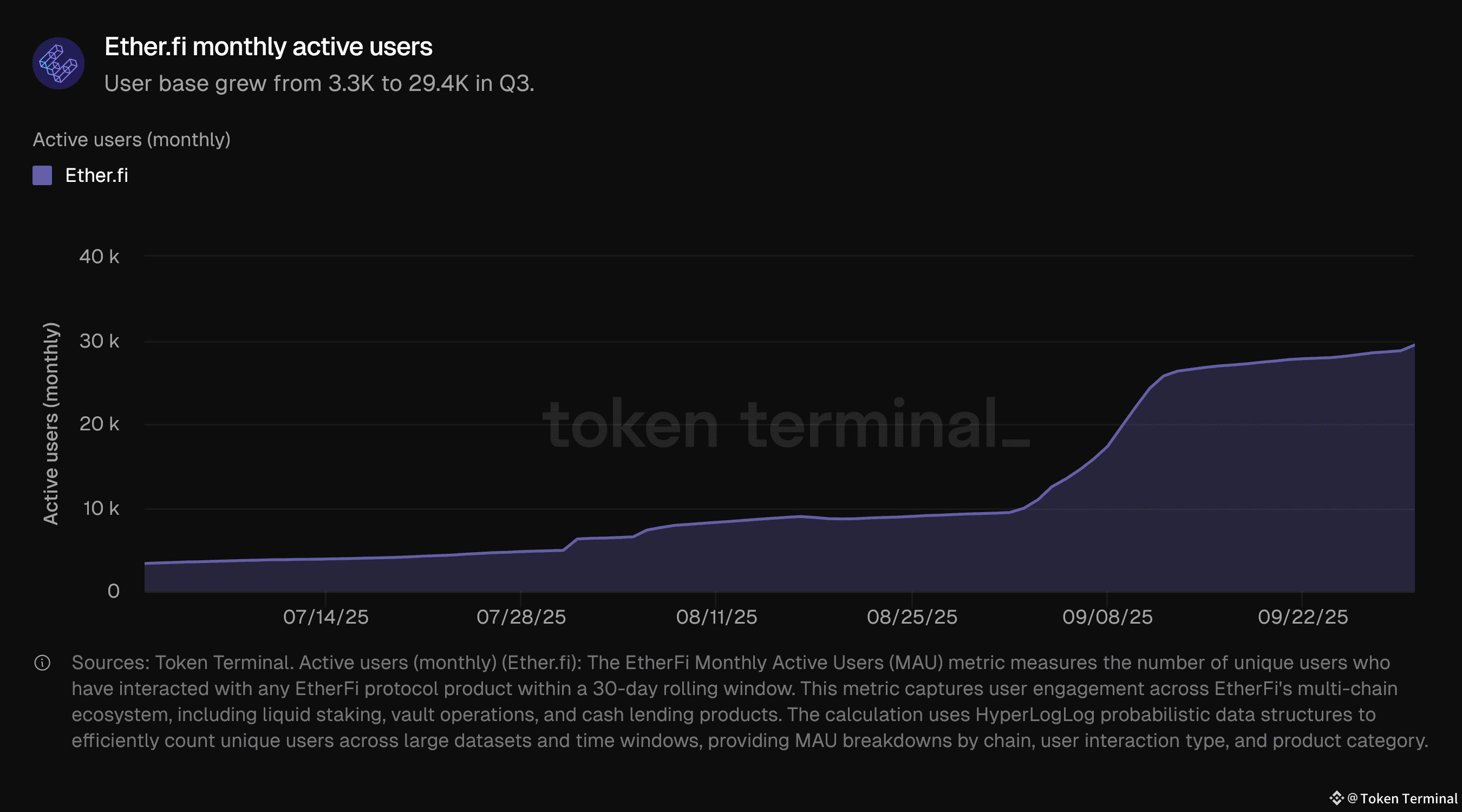 Monthly active users grew from 3.3K to 29.4K during Q3, driven primarily by Ether.fi Cash on Scroll, where strengthening product-market fit accelerated adoption to over 27K users by quarter-end. MAU measures unique users who interact with any Ether.fi protocol product within a 30-day rolling window across its multi-chain ecosystem.