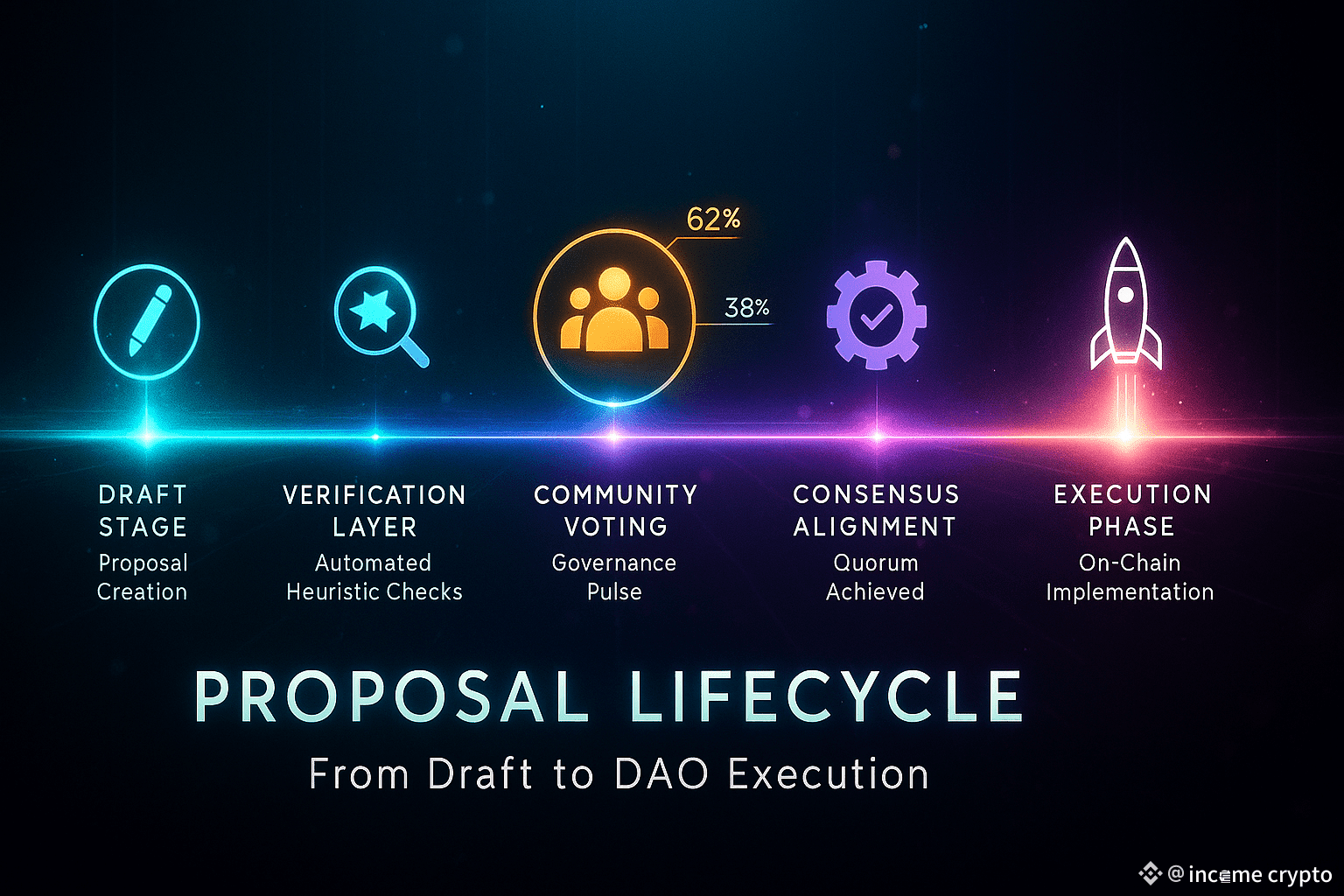 प्रस्ताव जीवनचक्र में कुछ स्पष्ट चरण होते हैं - ड्राफ्टिंग, कम्युनिटी डिस्कशन, औपचारिक प्रस्ताव (on-chain या off-chain), मतदान और निष्पादन। $ALT -Rumour का मॉडल इन चरणों को swimlane दृश्य के रूप में परिभाषित करता है ताकि हर स्टेकहोल्डर को पता रहे कि किस चरण में क्या जिम्मेदारी है और कौन सी क्रियाएँ ट्रिगर होंगी। यह स्पष्ट चरणबद्धता विवादों और समय-गत देरी को घटाती है।