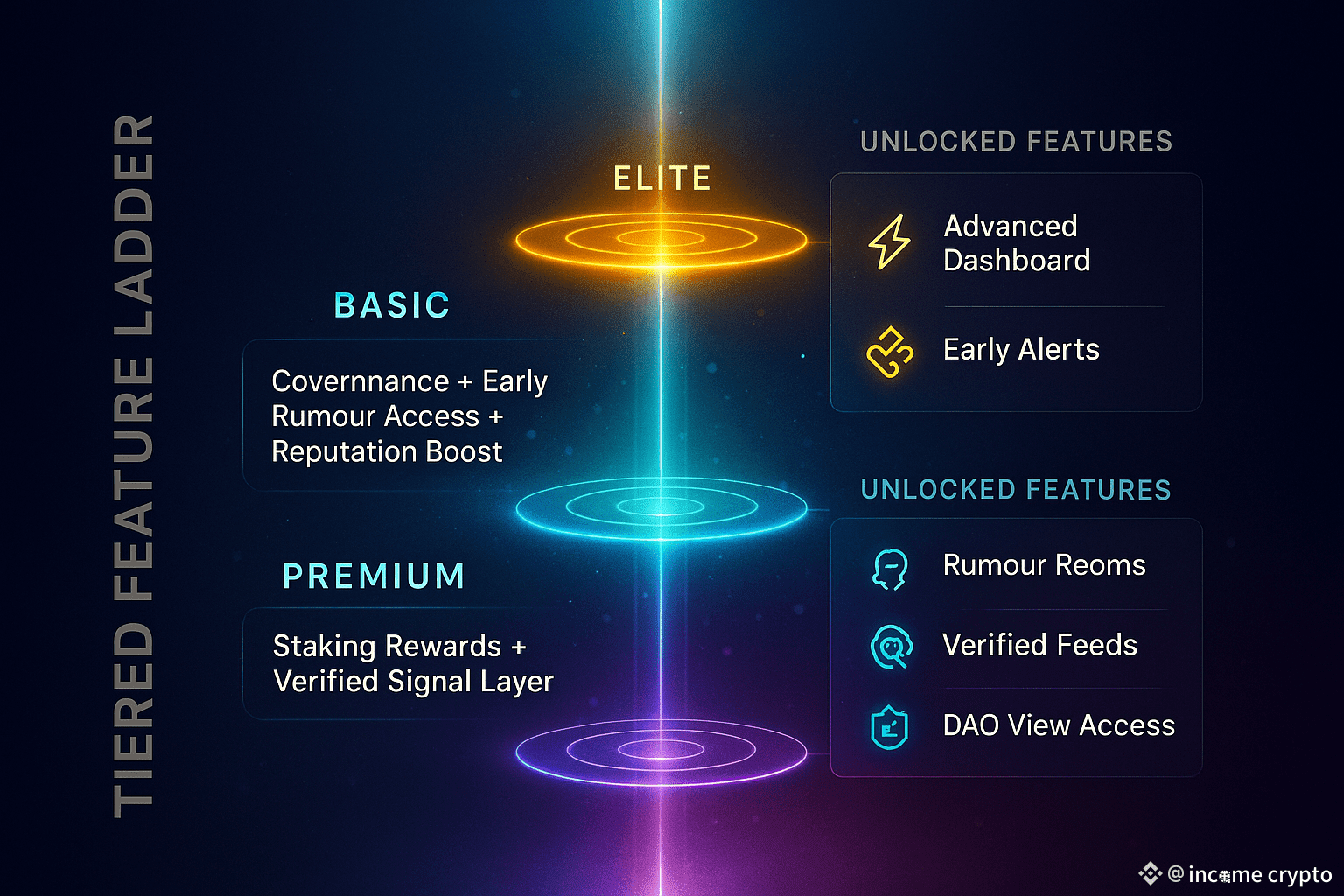 @rumour.app का टोकन-यूटिलिटी मॉडल स्पष्ट रूप से टियर-आधारित संरचना पर बना है। हर स्तर पर उपयोगकर्ता को विशेष सुविधाएँ और अधिकार मिलते हैं, जो उनकी भागीदारी, टोकन-होल्डिंग और गतिविधि के आधार पर निर्धारित होते हैं।