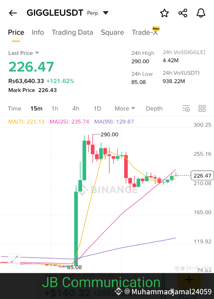 Giggle Coin, one of Binance’s most talked-about digital assets, is showing massive bullish momentum today. Currently, the coin has surged impressively and touched the **$290** mark — a clear signal of renewed investor confidence and strong market movement.