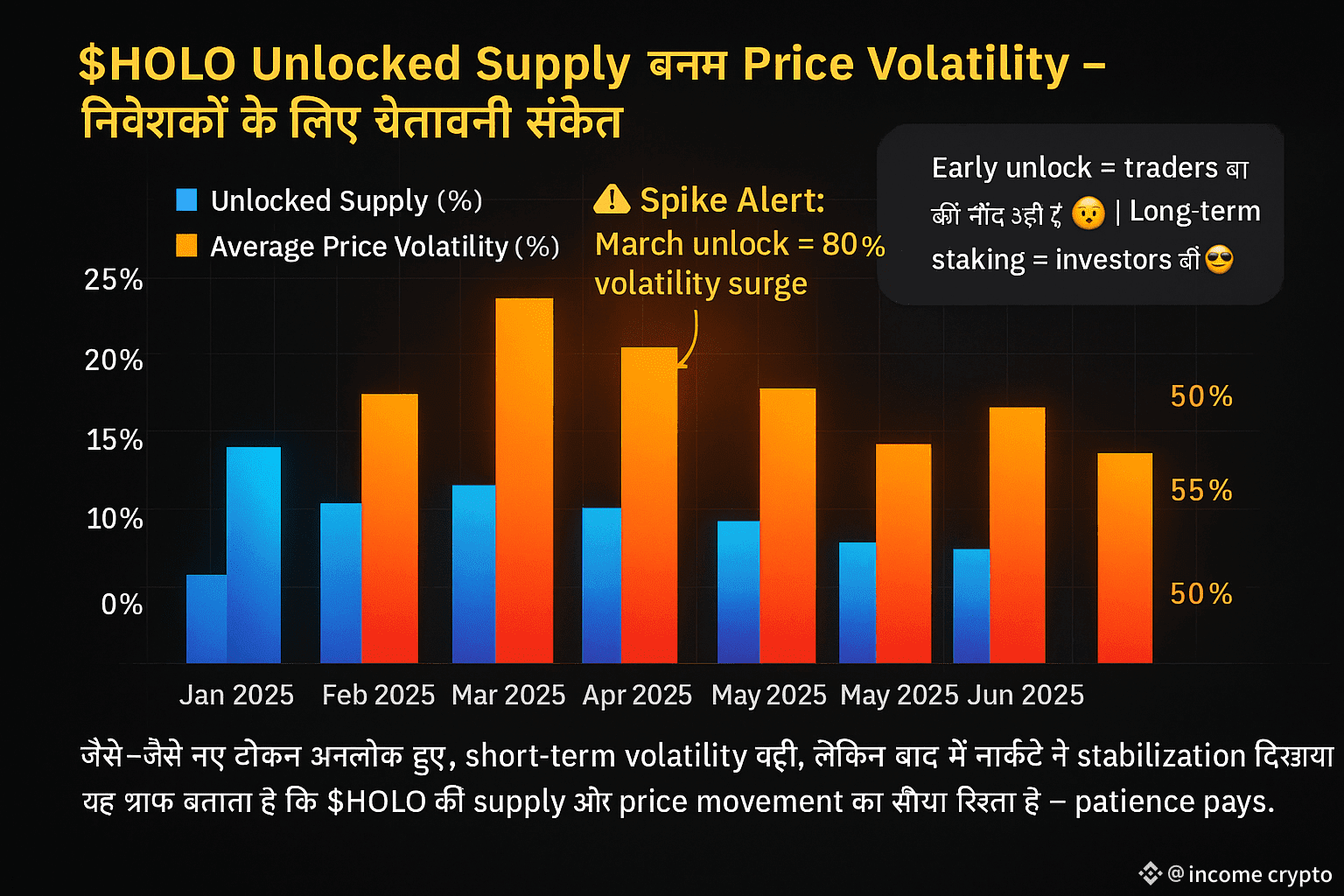 यह ध्यान देने योग्य है कि जैसे-जैसे नए टोकन अनलॉक होंगे, अल्पकालिक मूल्य दबाव आ सकता है। निवेशक अक्सर इन अनलॉक इवेंट्स के दौरान मुनाफा लेने की प्रवृत्ति रखते हैं, जिससे अस्थिरता बढ़ जाती है। एक उपयुक्त चार्ट हो सकता है: “HOLO Circulating Supply vs Upcoming Unlock Schedule”, जो बताएगा कि किन अवधियों में संभावित उतार-चढ़ाव अधिक रह सकता है।