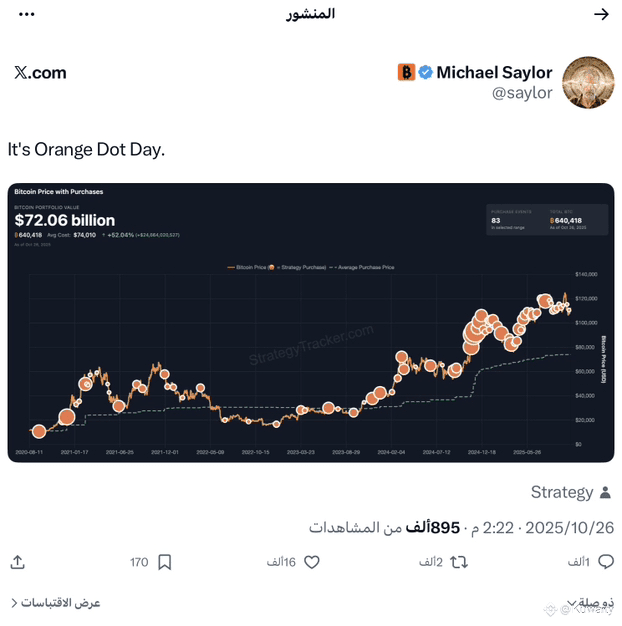 نشر على X لقطة شاشة لمتتبع بيتكوين الخاص باستراتيجية بجانب العبارة "إنه يوم النقطة البرتقالية." هذا تلميح غامض استخدمه مرارًا قبل إعلانات الشراء الرسمية.