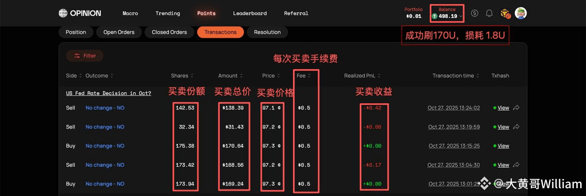 我刷了这笔成交额在 170U, 加上卖出共计 340U。损耗在 1.8U,这笔对我来说算是比较大的损耗了。所以1000U的话,损耗1.8/340*1000=5.3U,损耗控制在6U 以内都算正常。