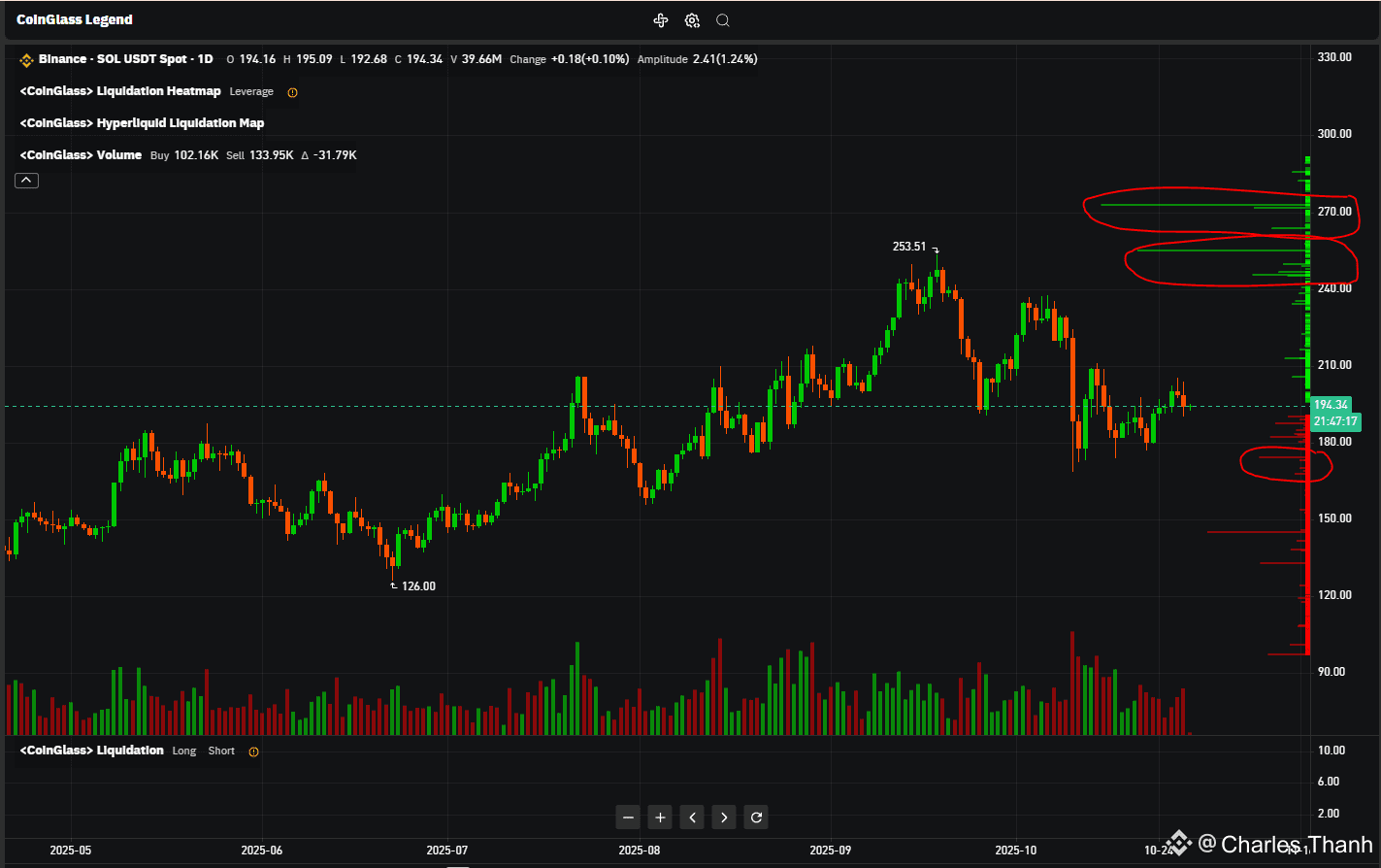 Dữ liệu thanh khoản từ CoinGlass cho thấy Solana (SOL) đang tích lũy quanh vùng 182 – 194 USD, sau nhịp điều chỉnh mạnh từ đỉnh gần 253 USD.