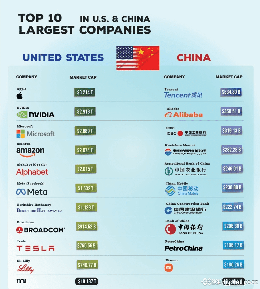 The three biggest companies in the U.S. are Apple, Nvidia, and Microsoft, while in China, the top players are Tencent, Alibaba, and ICBC.