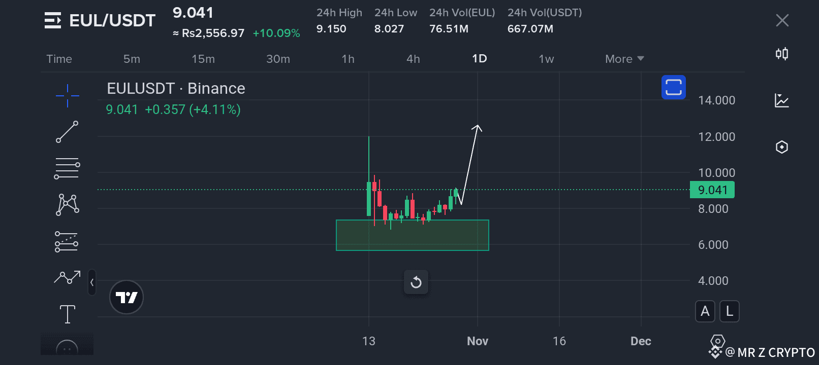 For the past few weeks, EUL has been trading within a tight range between $7.5 and $8.5, building a strong support base (shown in the green box). This accumulation zone acted as a cushion, absorbing selling pressure and allowing strong hands to enter quietly while weak hands exited.