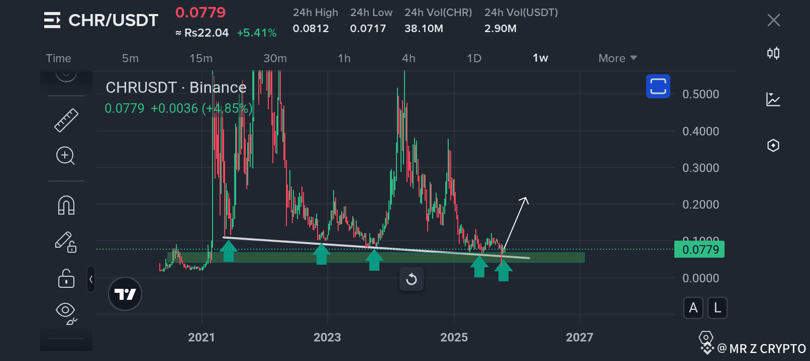 CHR is currently consolidating after months of steady decline, and this zone between $0.07–$0.08 has become a critical accumulation area — one that has historically triggered massive bullish reversals multiple times since 2021.