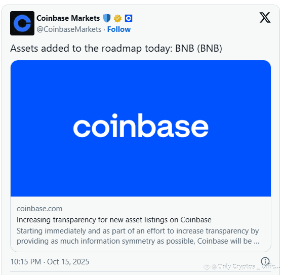 #coinbase Adds BNB to Its Asset-Listing Roadmap: Coinbase Markets announced that BNB was added to its roadmap, increasing transparency around potential future listings (not a guarantee). The move broadens BNB’s prospective U.S. exchange exposure and narrative reach.