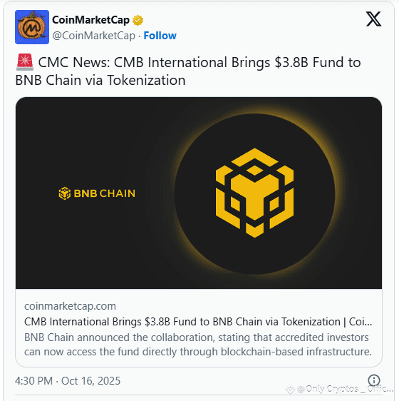 #CMB International Tokenizes a $3.8B USD Money Market Fund on BNB Chain: CMB International (China Merchants Bank) brought its flagship USD MMF on-chain via CMBMINT/CMBIMINT tokens, distributed by DigiFT—a major RWA milestone for BNB Chain’s institutional track.