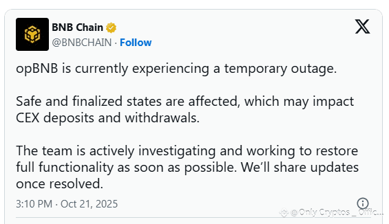 #opbnb Experiences a Temporary Outage: BNB Chain reported a temporary opBNB outage affecting safe/finalized states and certain CEX flows; operations were subsequently restored after mitigation.