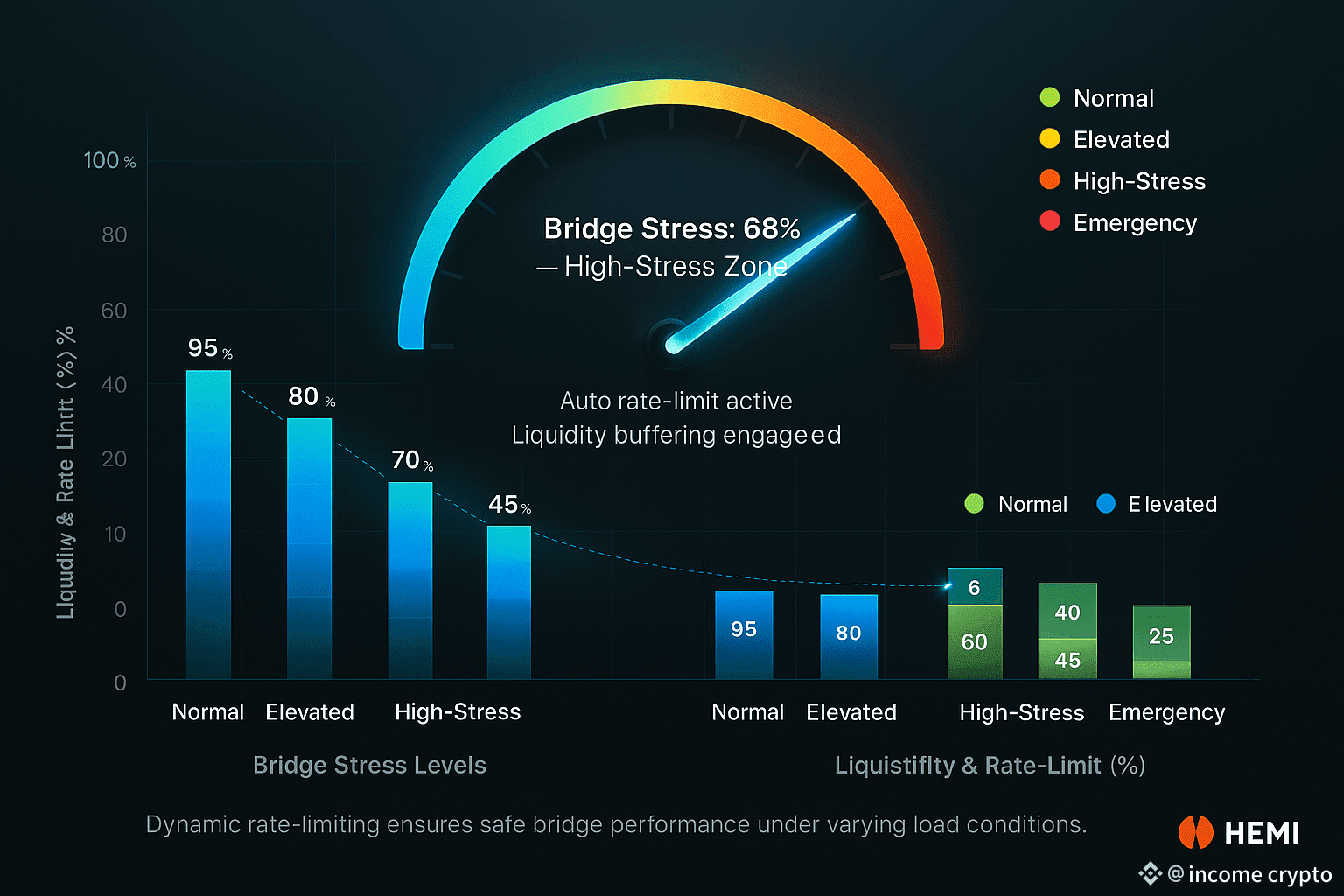 $HEMI का ब्रिज मॉडल स्थिरता को केंद्र में रखता है। यहाँ rate limits का अर्थ है ट्रैफिक-मैनेजमेंट, circuit breakers का अर्थ है landslide alert और liquidity backstop emergency-rescue का प्रतिनिधि है। अन्य नेटवर्क जहां blind throughput को प्राथमिकता देते हैं, HEMI कहता है कि smooth और protected throughput ही भरोसा बनाता है। यह मॉडल cross-chain users के लिए predictable और panic-free movement देने का उद्देश्य रखता है।