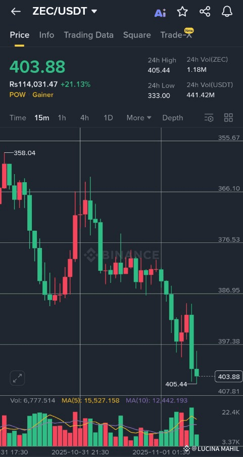 Right now, $ZEC is trading around $403–$404, sitting just below the intraday high of $405.44. Volume is surging, volatility is expanding, and the entire trend structure is leaning bullish. Every pullback so far is being absorbed instantly, showing clear buyer dominance.
