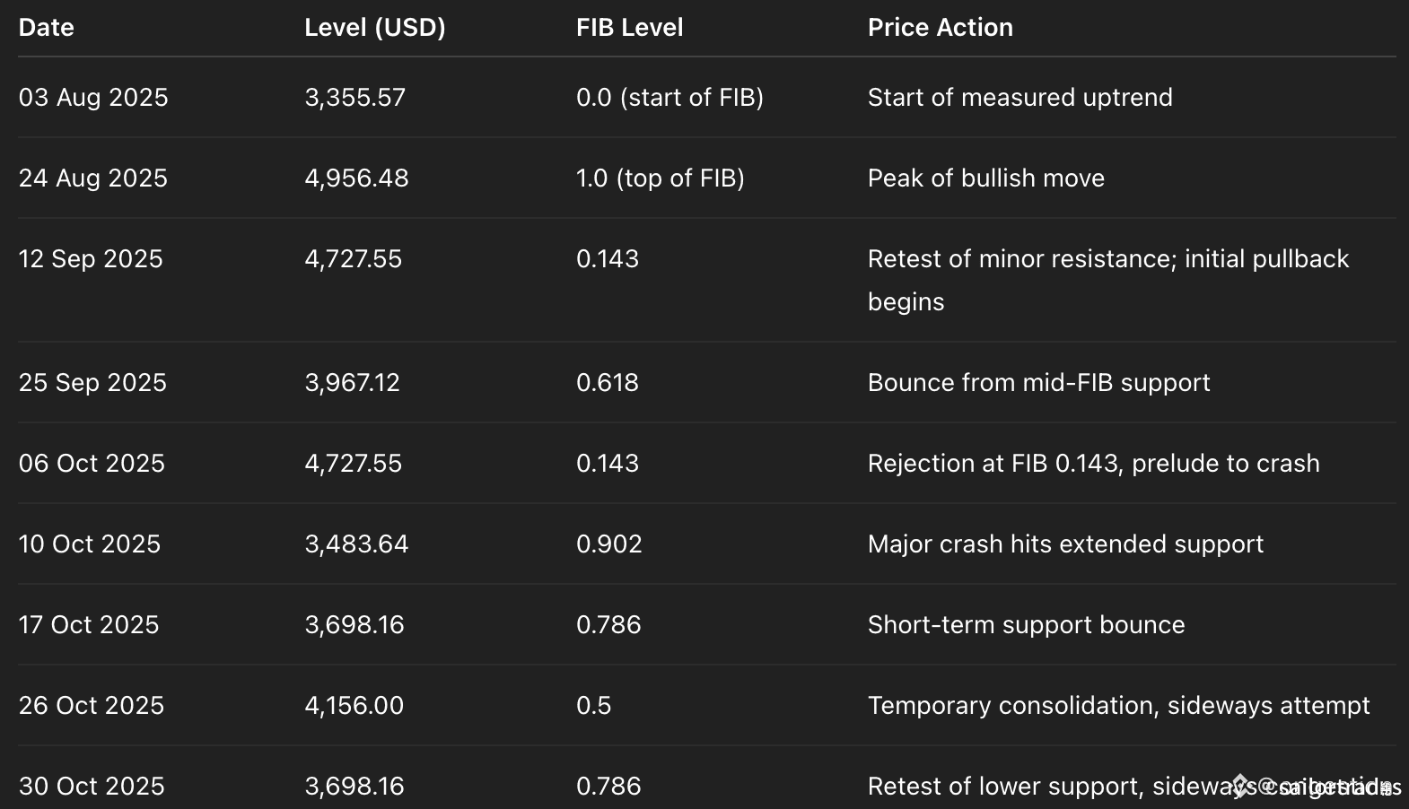 Sideways movement and congestion mostly occurred between 0.414–0.618, indicating intermediate accumulation zones.