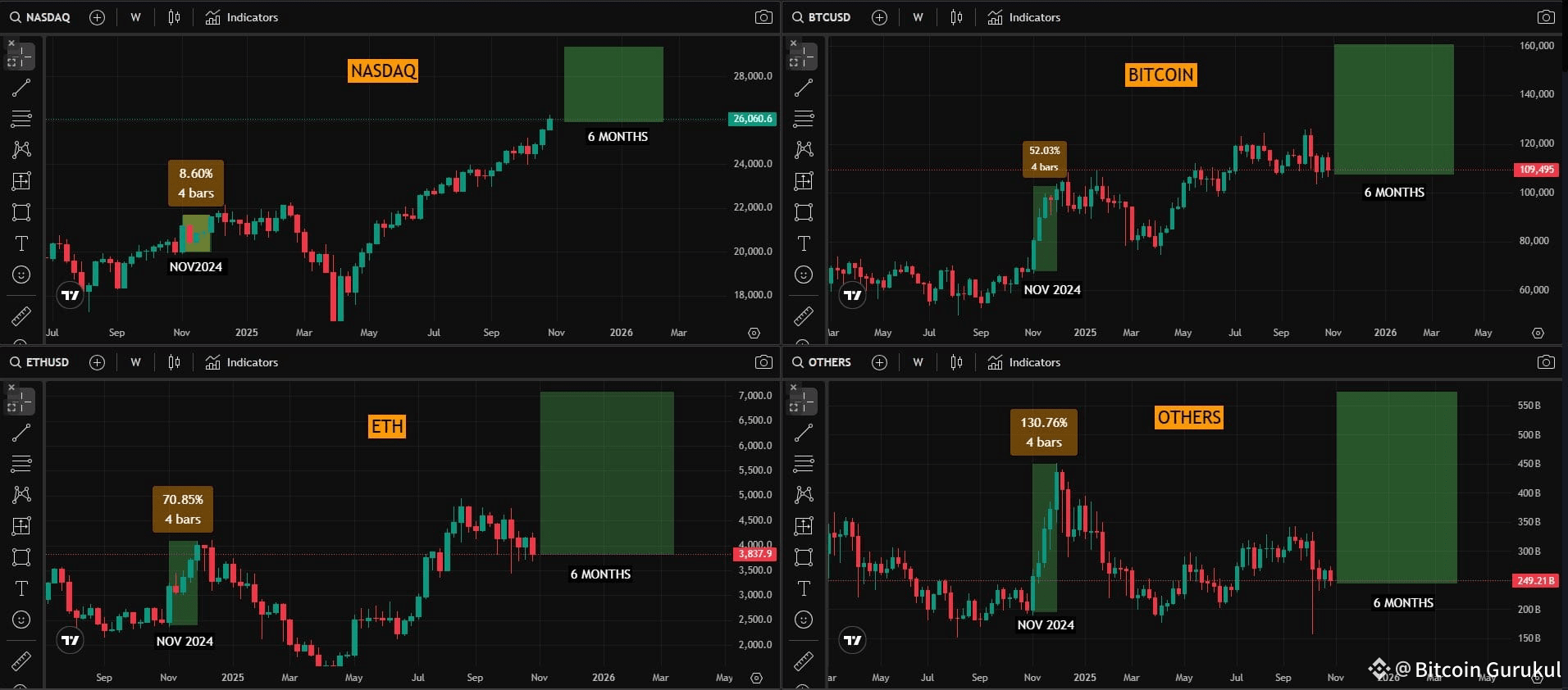 Look at November 2024. NASDAQ climbed 8.6%. Bitcoin surged 52%. Ethereum jumped 70%. Altcoins exploded 130%. These weren't separate events—they were chapters in the same story, written in different languages but following the same plot.
