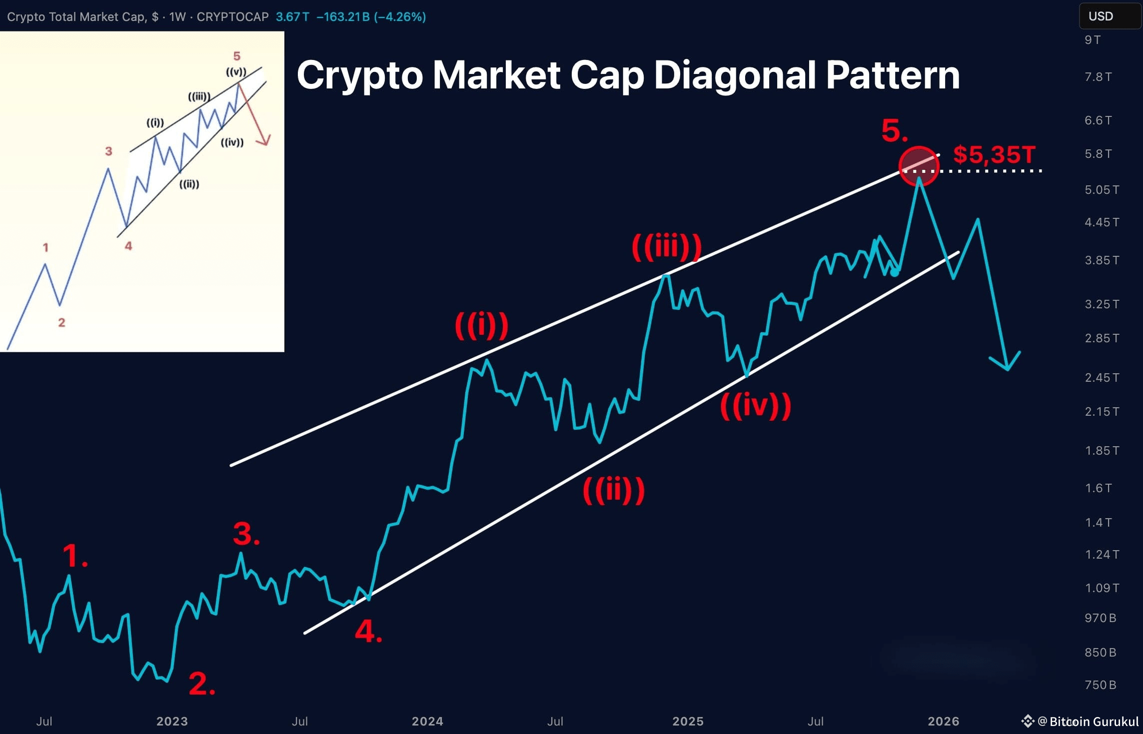 The chart tells a story in five distinct waves. We've already witnessed waves 1 through 4—the initial surge, the correction, the powerful rally to previous highs, and the pullback that made everyone question whether Bitcoin and the broader market still had legs. Now we're in wave 5, and according to this analysis, the target is crystal clear: $5.35 trillion in total market capitalization.