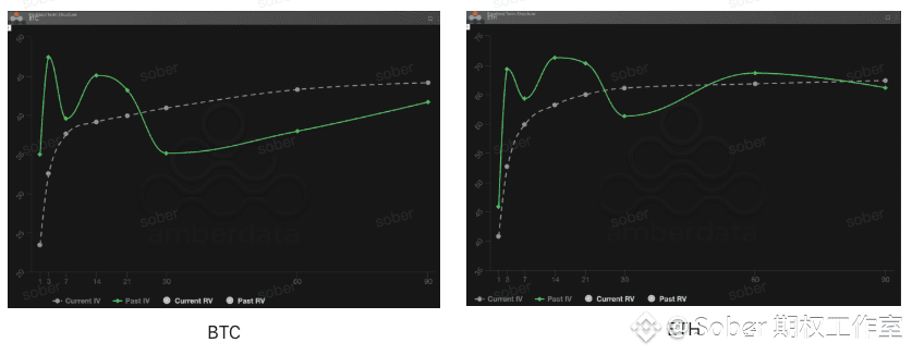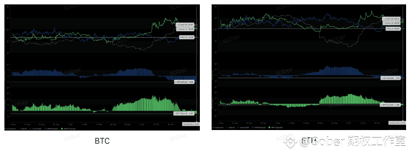 BTC的VRP Realized(-8.38)负值更深于ETH的(-7.76),意味着过去30天BTC实际经历的波动(RV)超出了市场原有的期权定价预期,市场对其波动的低估更为显著。