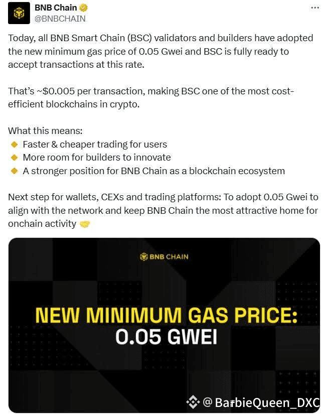 “Next step for wallets, CEXs and trading platforms: To adopt 0.05 gwei to align with the network and keep BNB Chain the most attractive home for onchain activity,” the team said.