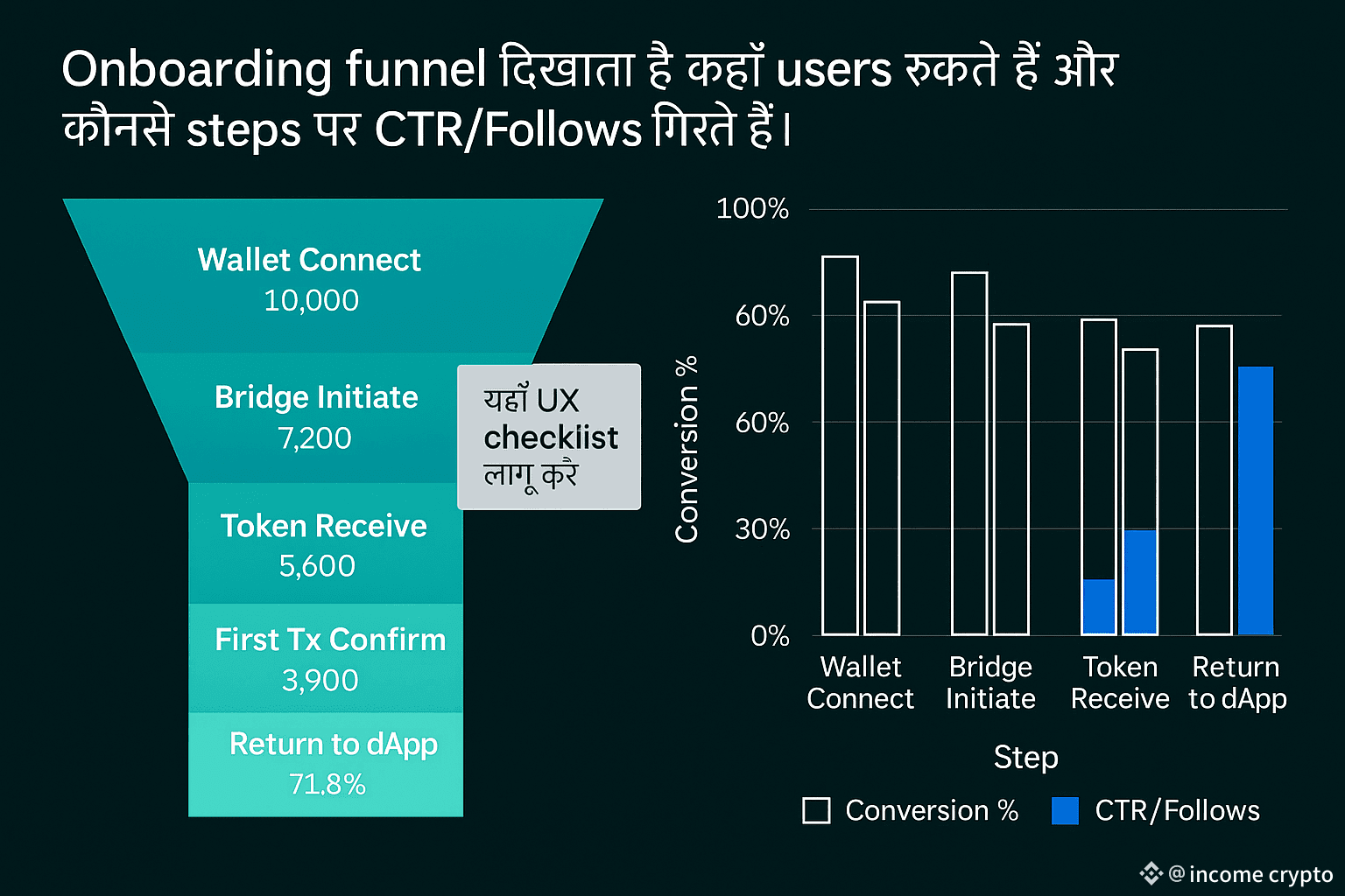 एक smooth onboarding journey map बनाना प्रभावी रहेगा जिसमें wallet connect से लेकर first transaction confirm तक हर चरण दिखे। Linear Sankey-style flow से CTR और drop-off rate visual हो जाएंगे और यह format social पर share-friendly भी रहेगा।