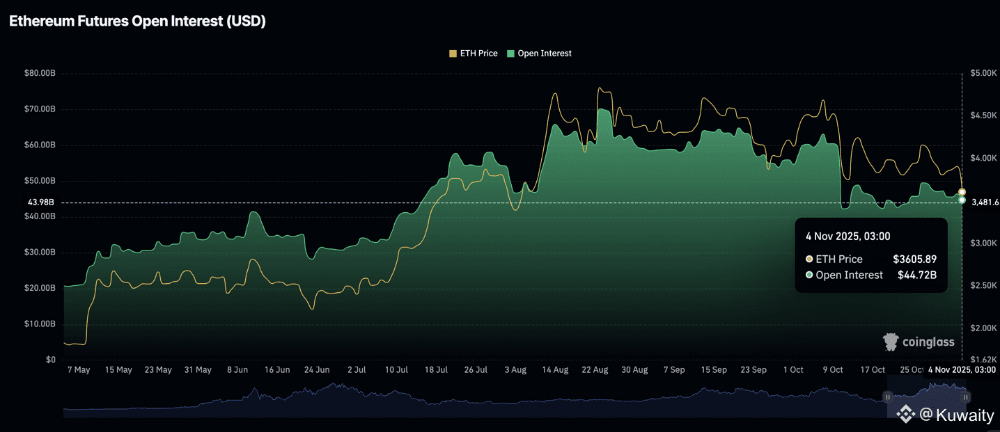 كما تراجع الطلب من التجزئة على إيثريوم بشكل كبير، حيث انخفضت الفائدة المفتوحة في العقود الآجلة إلى 44.72 مليار دولار من ذروتها في أكتوبر البالغة حوالي 63 مليار دولار.