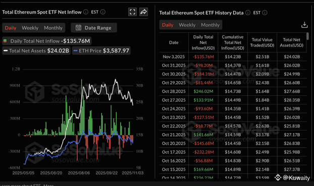 تراجع المستثمرون المؤسسيون عن السعي للحصول على تعرض لصناديق إيثريوم المتداولة في البورصة (ETFs). وفقًا لـ SoSoValue، شهدت الصناديق المتداولة في البورصة المدرجة في الولايات المتحدة تدفقات خارجة بقيمة 136 مليون دولار يوم الاثنين، مما أدى إلى إجمالي التدفقات الصافية إلى 14.23 مليار دولار والأصول الصافية إلى حوالي 24 مليار دولار.