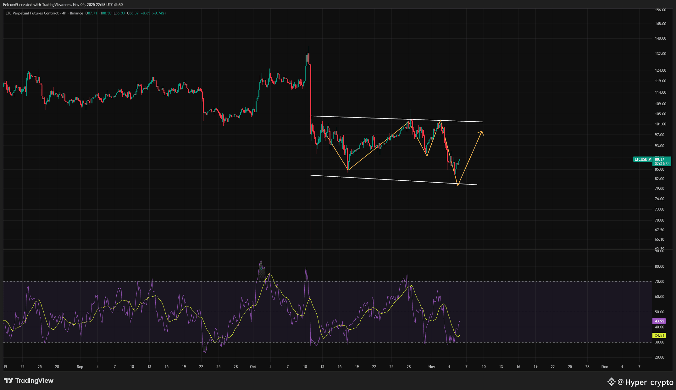 I can see LTC descending channel pattern.This is often a bull flag or bullish reversal pattern. The price is currently near the middle of the channel. The projected path (orange arrow) suggests a final dip to the lower boundary near $85.00, followed by a strong rally and an eventual breakout 🚀above the upper line, aiming for $100.00.