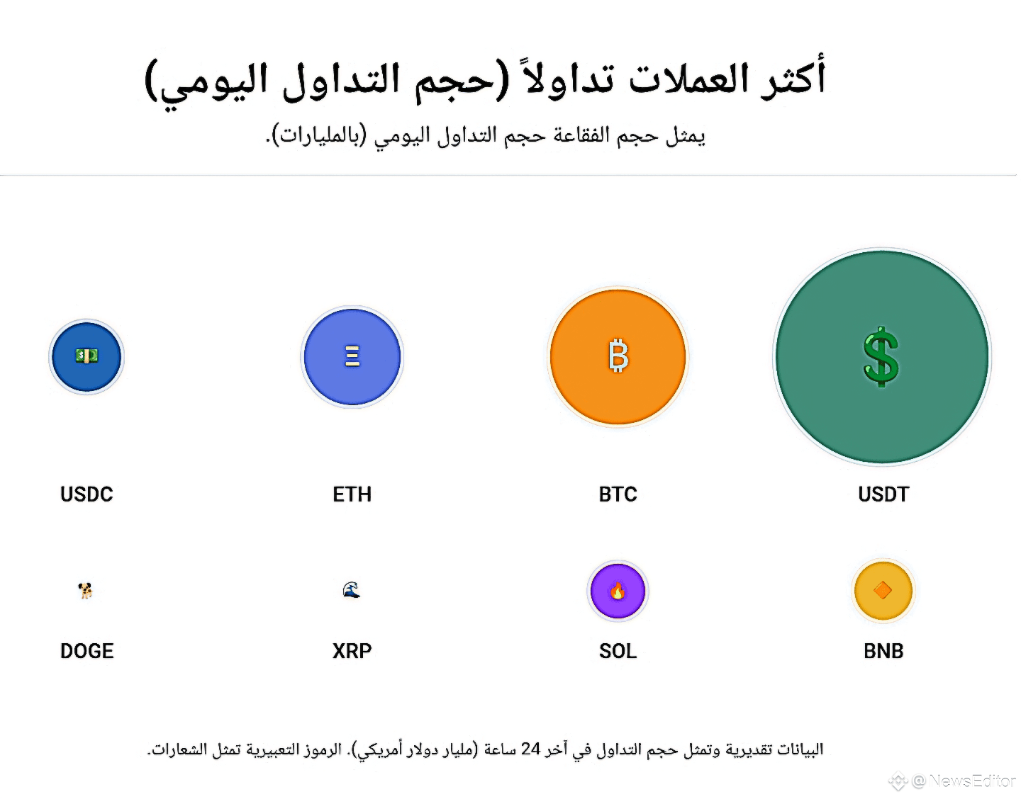 بناءً على حجم التداول اليومي وبيانات السوق الحالية لهذا الأسبوع (بداية نوفمبر 2025)، فإن العملات الأكثر تداولاً هي: