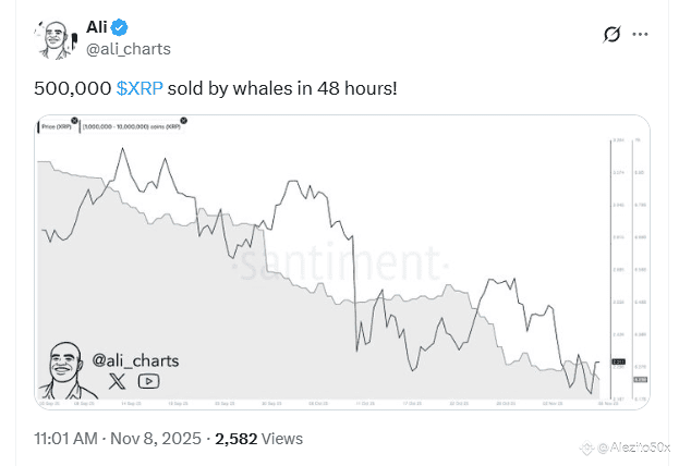 El analista de mercado Ali señaló recientemente que las billeteras de ballenas que poseen entre 1 millón y 10 millones de XRP 🎯 han estado reduciendo posiciones durante la última semana. El gráfico lo confirma: tanto las tenencias de ballenas como el precio de $XRP han estado cayendo desde principios de septiembre hasta principios de noviembre. 🗓️ Estas ballenas no están comprando en las caídas 🙅♂️; están vendiendo constantemente en el mercado. 🛒