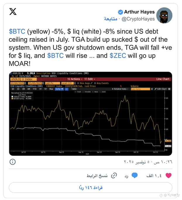 وصف آرثر هايز هذه الديناميكية بأنها "تسييل كمية خفية بالعكس." في الوقت الذي تحتكره الخزانة النقد، تضيق السيولة، تسقط الأصول ذات المخاطر، وتصحيح بيتكوين.