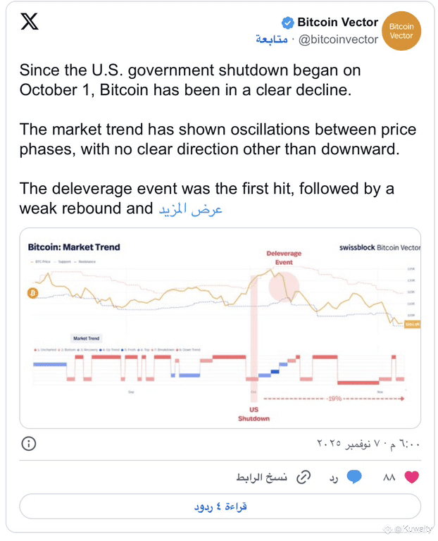 تسببت إغلاق الحكومة الأمريكية في تجميد أكثر من 850 مليار دولار من النقدية في الخزانة، مما أدى إلى استنزاف السيولة وسحب البيتكوين حوالي 5% للأسفل.