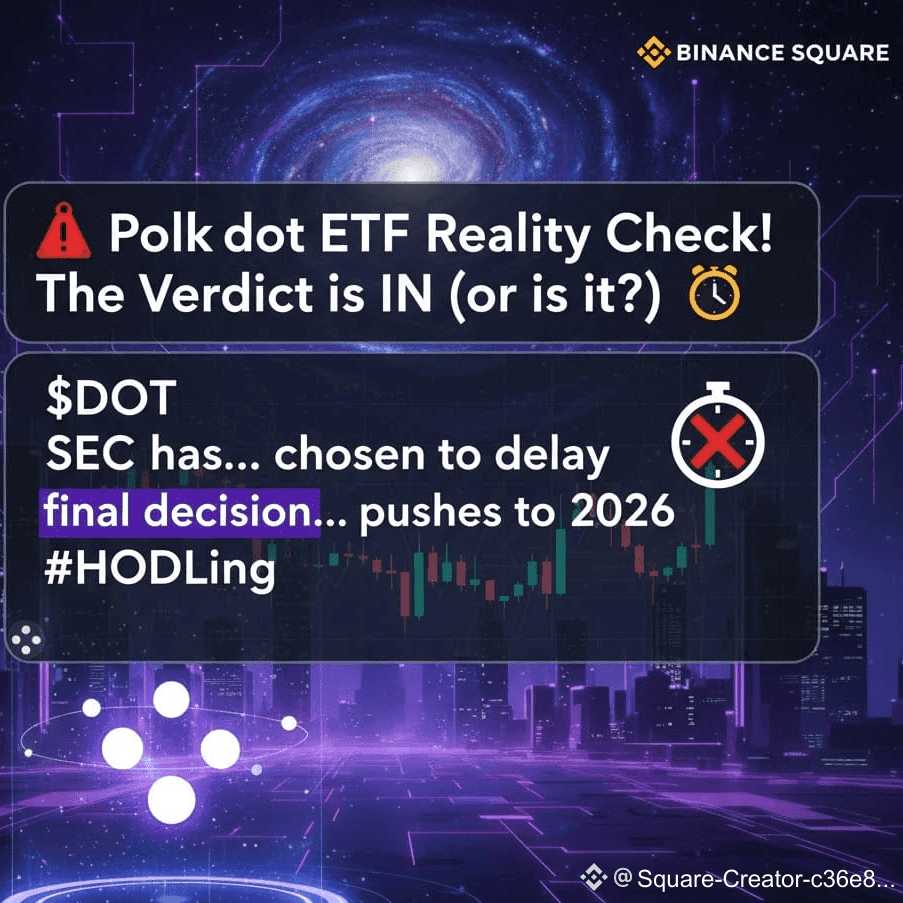 لقد اختارت SEC، كما هو متوقع، تأجيل قرارها النهائي بشأن طلب ETF غرايسكيل DOT. هذا يمدد الحكم النهائي إلى الموعد النهائي الرابع والأخير، والذي تم تحديده حاليًا في 8 نوفمبر (ولكن في 2026، أو في وقت سابق من العام المقبل اعتمادًا على التقديم المحدد). تصحيح: تم ذكر موعد نهائي نهائي في 8 نوفمبر 2025 في دورات الأخبار السابقة، ولكن الموضوع المتكرر هو تأخير كبير، غالبًا ما يمتد إلى منتصف أو أواخر 2026 لقرارات المرحلة النهائية بشأن ETFs العملات البديلة. ساحة باينانس مشغولة بمجموعتين: أولئك الذين يرون ذلك كتأجيل قياسي من SEC (وجهة نظر 'اللعبة الطويلة') وأولئك الذين يقومون بتقليل المخاطر من أجل انخفاض قصير الأجل.