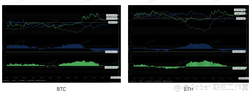 VRP Realized 负值加深:过去 30 天的实际波动依旧保持在高位,导致隐含与实现波动的偏差扩大,反映市场对近期波动冲击的吸收仍不充分。