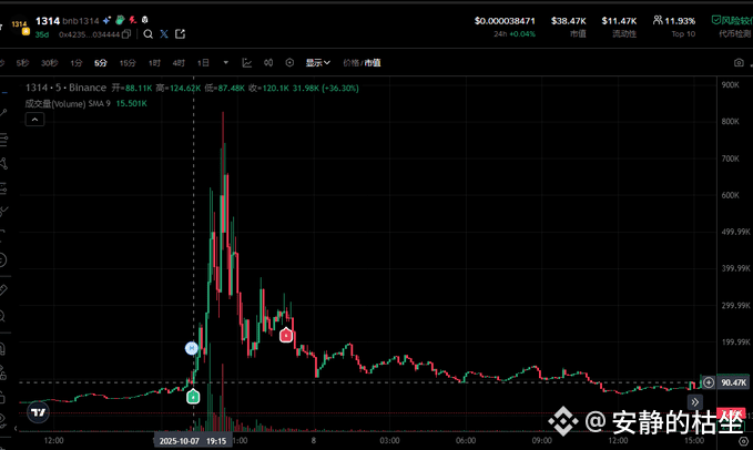 这是我第一次买meme币,90K买入最高市值800K,在此之前从来没有打过狗,没有打狗的经验,适逢币安人生,发现市场情绪浓厚,所以试着买了一个名字叫1314的meme币。一直拿到归零,期间BNB价格达到1314USDT/枚,币安华语官方推特账户转发了当时BNB的实时价格,借着这一波流量,这个MEME获得了巨大的上涨.