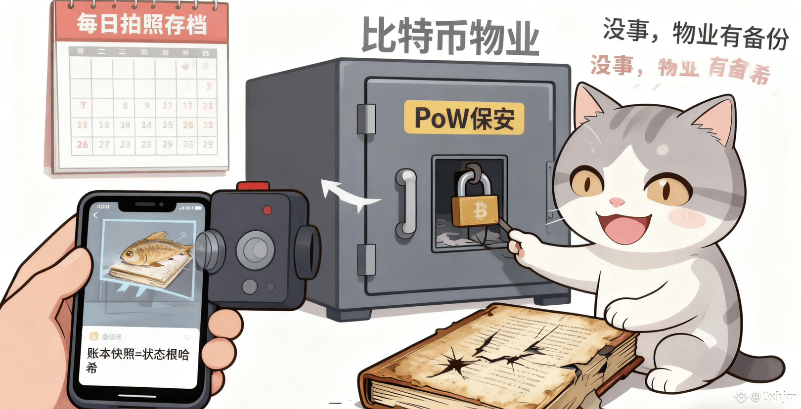 后来他学乖了:每天拍张账本照片,交给小区物业存档。物业的保险柜有锁,还有保安24小时看着,谁也拿不走、改不了——Plasma的状态根哈希,就是存在“比特币主网”这个“超级物业”里,安全到离谱。