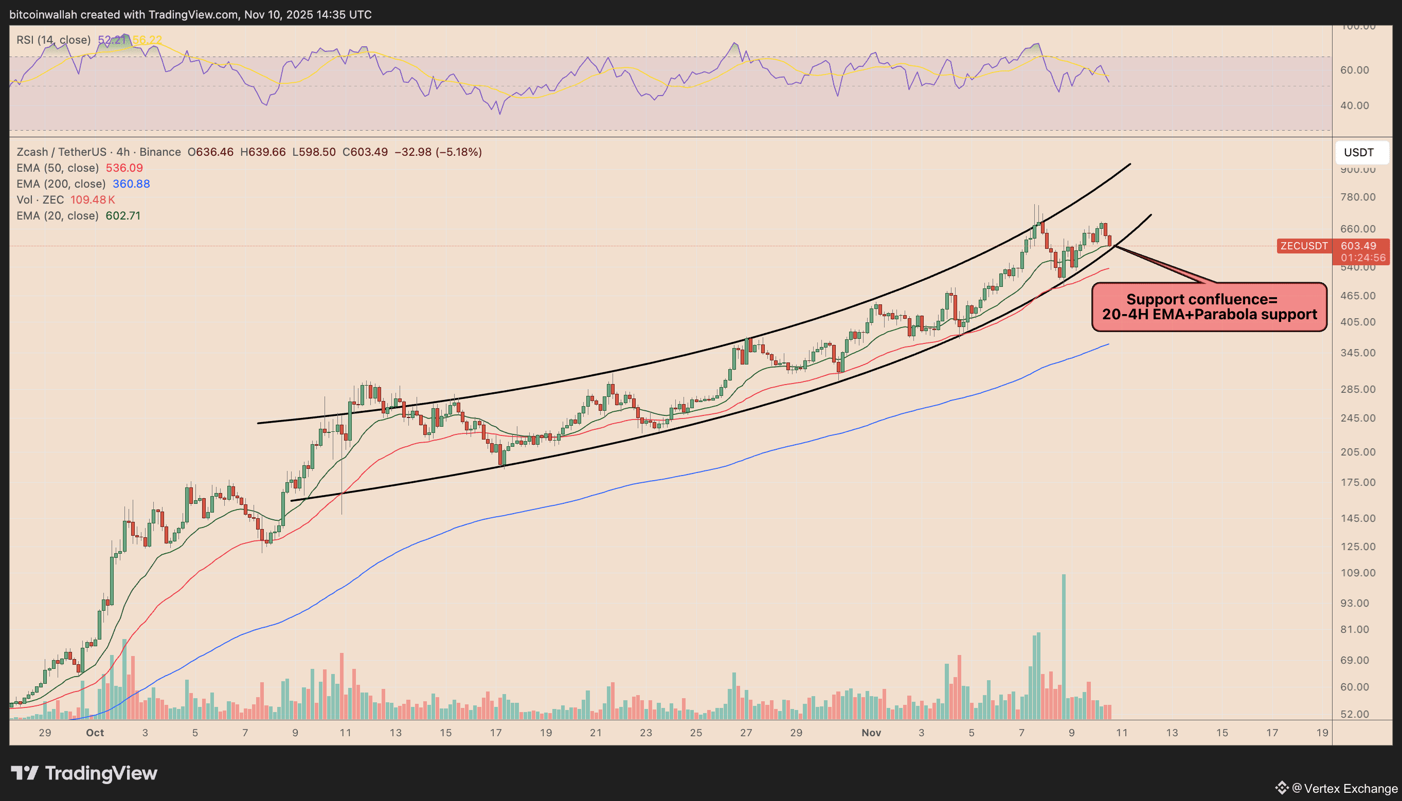 En 2021-2022, ZEC se desplomó más de 95% tras registrar una señal relativamente menos grave. Las correcciones anteriores por sobrecompra en el gráfico semanal indican que el precio de ZEC se está acercando a su media móvil exponencial de 20 semanas (EMA de 20 semanas, representada por la onda verde). A día de hoy, la onda EMA se sitúa en torno a USD 230, casi 62% por debajo de los precios actuales. En el gráfico de 4 horas, ZEC se mantiene dentro de un canal parabólico pronunciado, probando actualmente una confluencia de soporte clave formada por la EMA de 20 y la línea de tendencia parabólica inferior.